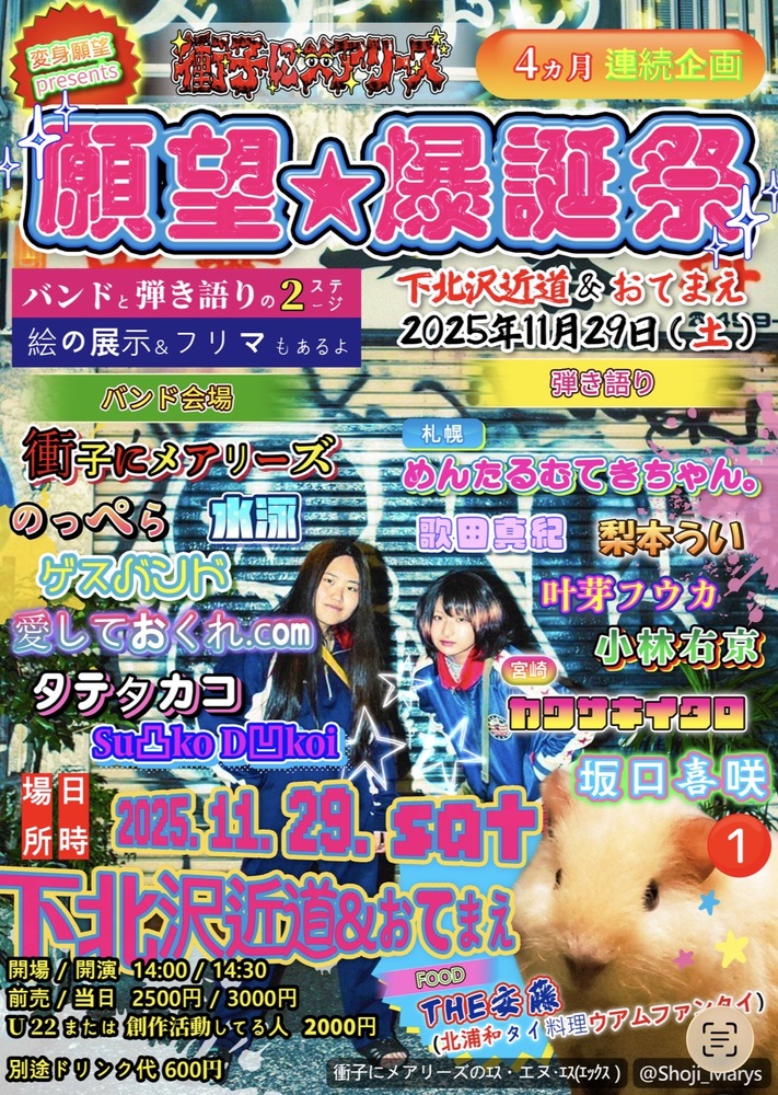 【LIVE】11/29(土)下北沢おてまえ ライブ予定 2025/11/29(土) 14:30 - 下北沢おてまえ Open 14:00 Start 14:30 衝子にメアリーズ/のっぺら/ゲスバンド/愛しておくれ.com/タテタカコ/水泳/カワサキイタロ/歌田真紀 /めんたるむてきちゃん/梨本うい/小林右京/叶芽フウカ 前売2,500円 当日3,000円 U 22 or 創作活動割引 2,000円 各+ワンドリンク600円 お取り置きはこちらから URLをコピーする 報告する