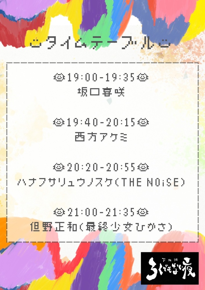 【LIVE】1/15(木)下北沢ろくでもない夜 ライブ予定 2025/12/21(日) 下北沢ろくでもない夜 Open18:30 / Start 19:00 坂口喜咲、西方アケミ、但野正和(最終少女ひかさ)、ハナフサリュウノスケ(THE NOiSE) 前売り当日共に¥3,000+1Drink 私の出番は1番目、19:00〜です! お取り置きはこちらから URLをコピーする 報告する