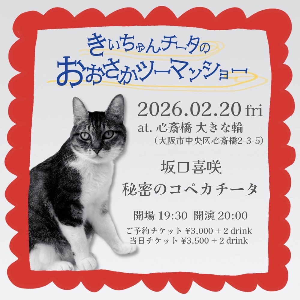 【LIVE】2/20(金)大阪心斎橋 大きな輪 ライブ予定 2026/02/20(金) 19:30 - 大阪心斎橋 大きな輪 Open 19:30 / Start 20:00 坂口喜咲、秘密のコペカチータ 前売り¥3,000+2drink お席が少ないため、お早めのご予約をおすすめいたします◎ ご予約はこちらから URLをコピーする 報告する
