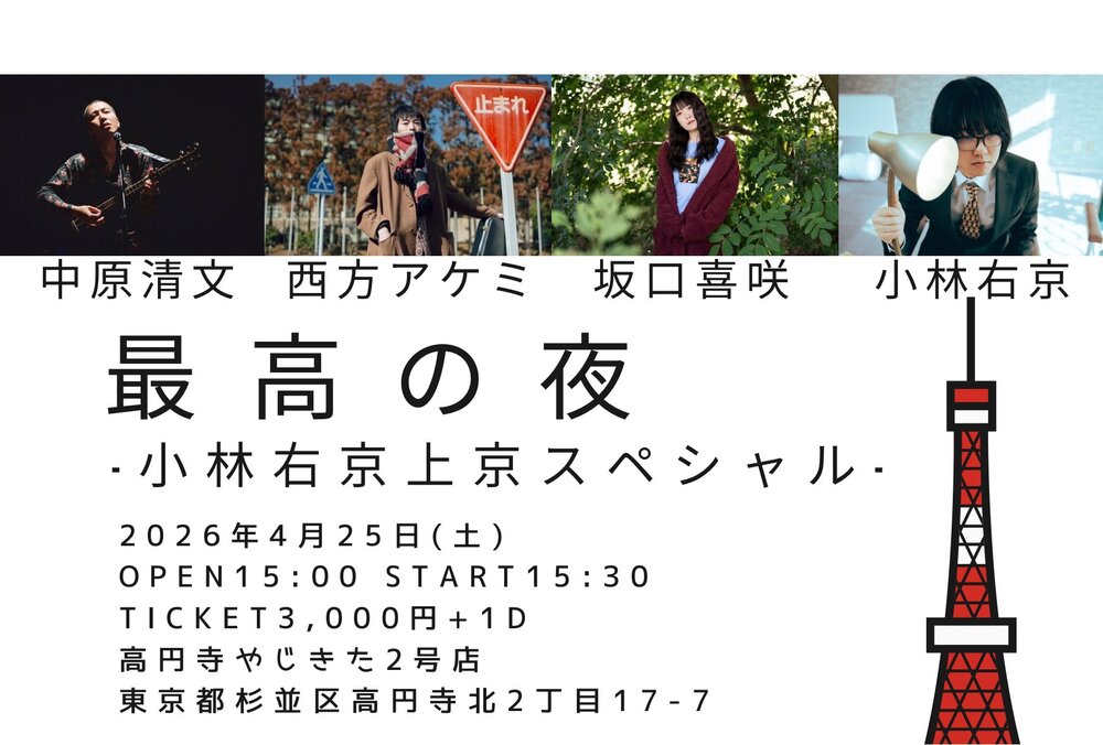 【LIVE】4/25(土)高円寺やじきた2号店 ライブ予定 2026/04/25(土) 15:30 - 高円寺やじきた2号店 Open 15:00 / Start 15:30 小林右京、坂口喜咲、中原清文、西片アケミ お取り置きはこちらから URLをコピーする 報告する